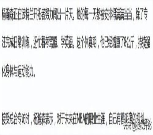 根据央视体育的报道,杨瀚森尽管缺席了男篮亚洲杯,但他在波特兰的每一天都被安排得满满当当,除了专注完成日常训练,还忙着考驾照、学英语。这个休赛期,他已经增重了8公斤,持续强化身体与运动能力。