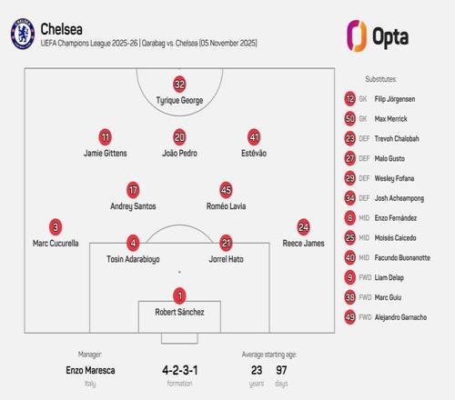 切尔西即将在欧冠联赛阶段第4轮客场挑战卡拉巴赫,目前他们已经公布了球队的首发阵容。