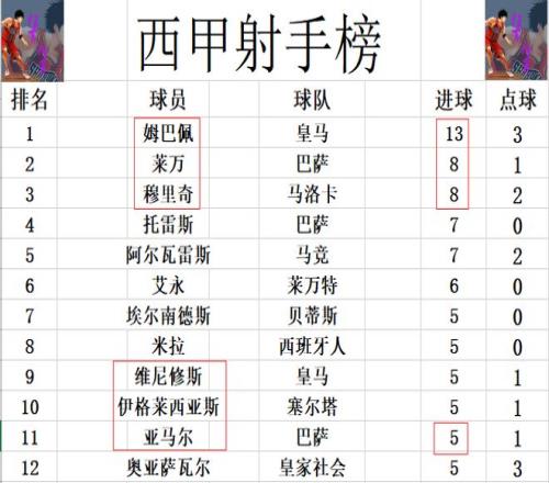 射手榜方面,姆巴佩13球稳居榜首,莱万今天只有一次助攻没有进球,被梅开二度的穆里奇追上,两人8球并列第2。托雷斯和阿尔瓦雷斯今天都是替补登场没有破门,7球并列第4。亚马尔传射建功,追上维尼修斯,奥亚萨瓦尔等人5球刚好挤入前十。