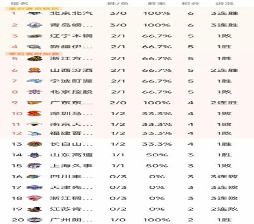 CBA常规赛第三轮结束了8场比赛,最新积分榜如下!