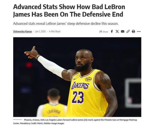 高阶数据很少对老将巨星友好,但本赛季勒布朗·詹姆斯在防守端的表现更是惨不忍睹,这是他职业生涯中首次出现如此不容忽视的局面。