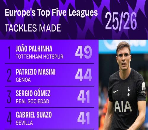 本赛季至今欧洲五大联赛抢断榜:帕利尼亚第49次第一 -