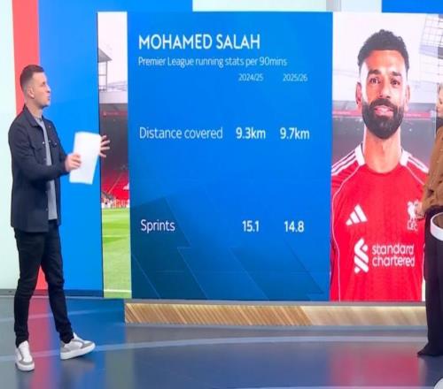 萨拉赫上赛季英超每90分钟跑动9.3公里,本赛季9.7公里 -